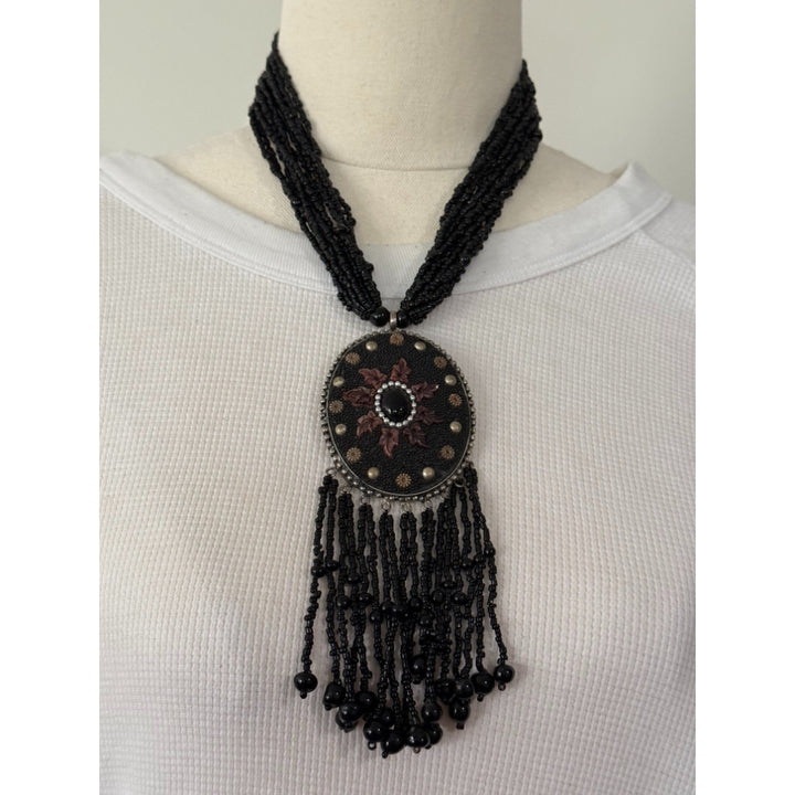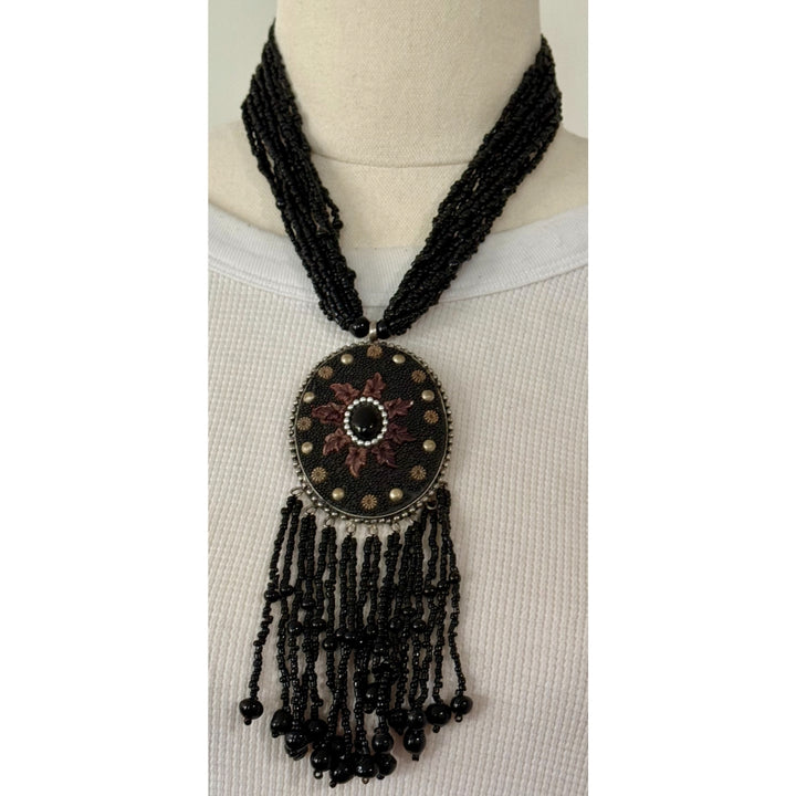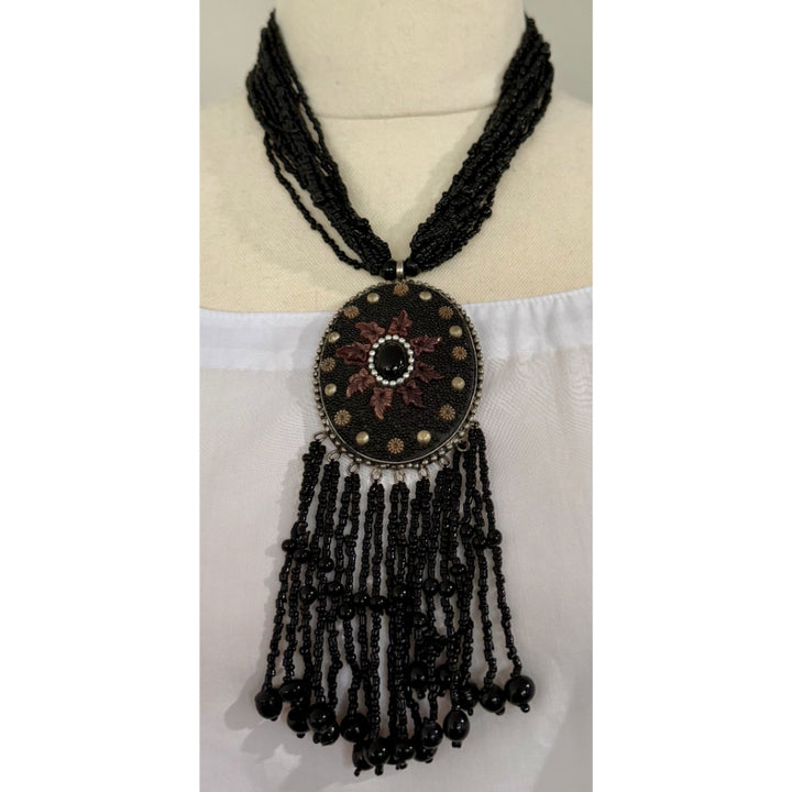 Black Embroidered Medallion Fringe Necklace