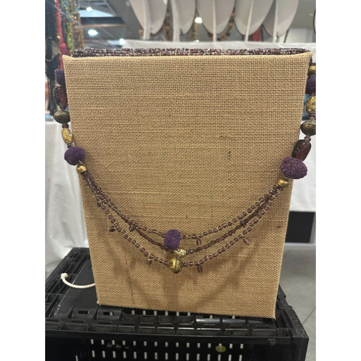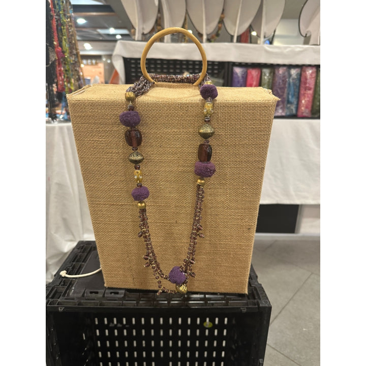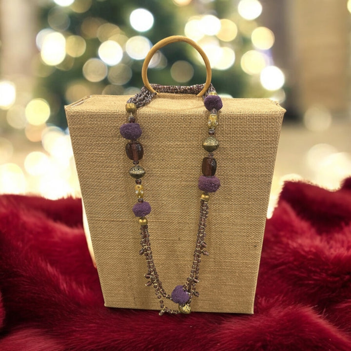 Plush amethyst pom-poms dance across gold-toned tribal layers - joyful texture with a regal glow.