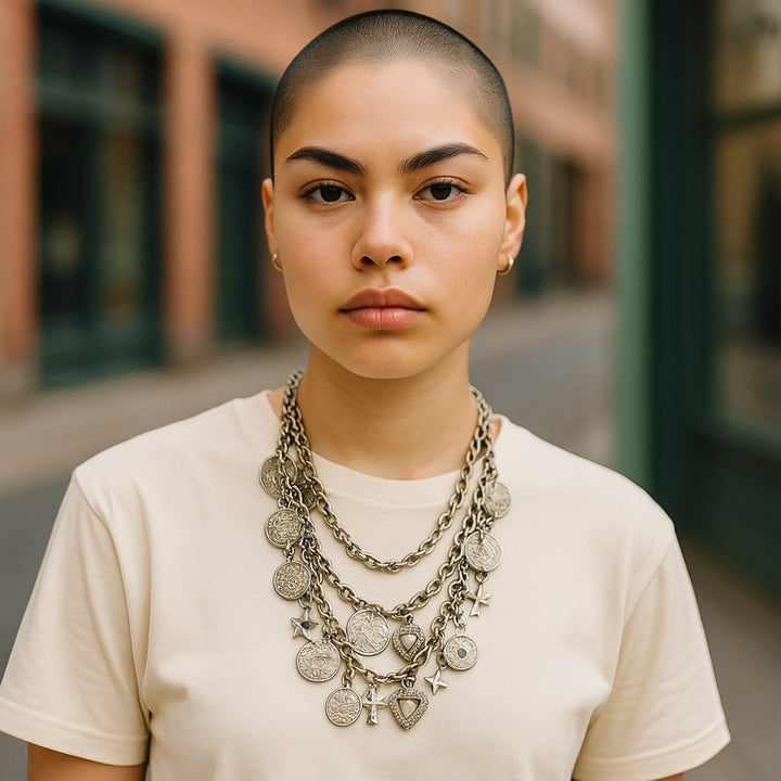 Oxidized silver layers dotted with petite charms deliver instant stack-appeal - effortless, versatile, and timeless.