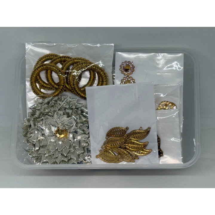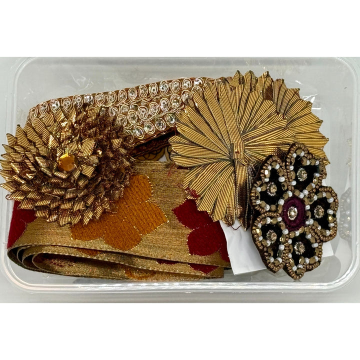 - Includes a mix of premium trims, embroidered patches, sequined appliqués, and metallic ribbons